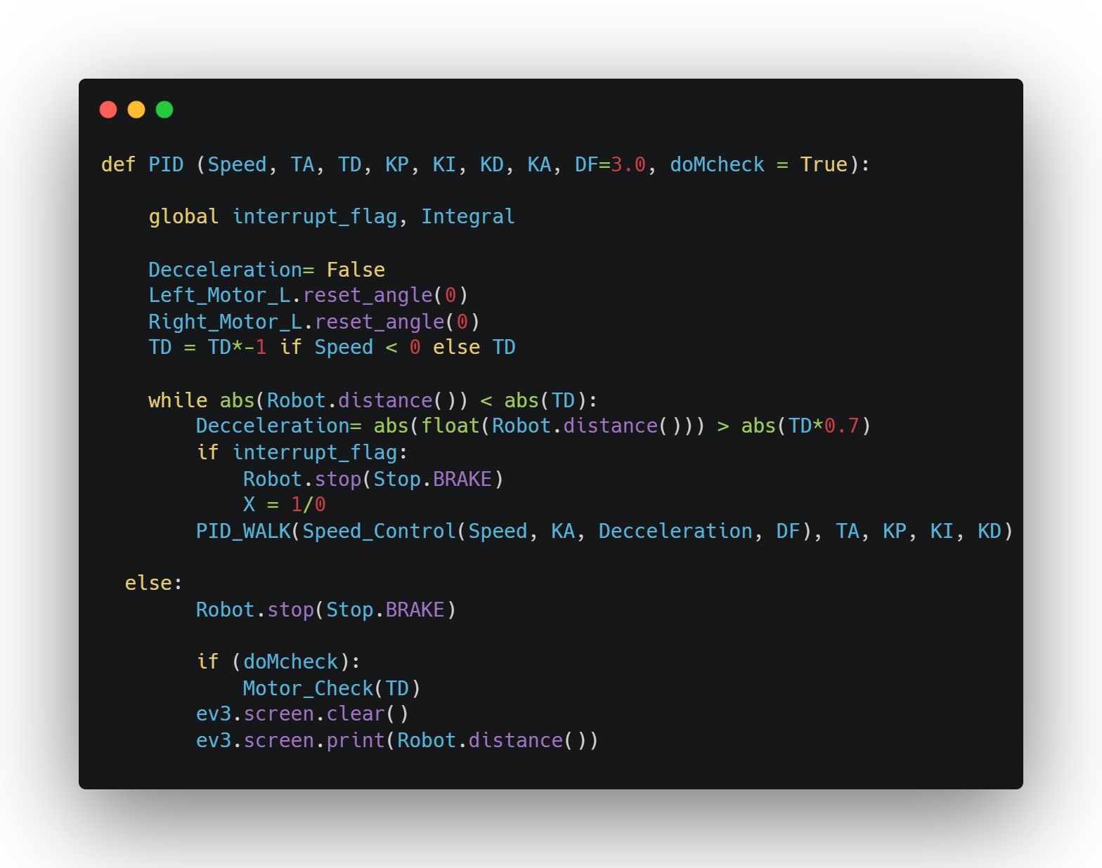 The PID function ties together the previously defined Speed_Control and PID_WALK functions, creating a comprehensive control system for the robot to walk with smooth, accurate, and responsive movement using PID control. It takes several parameters: target speed (Speed), target angle (TA), total distance (TD), and the three PID constants (KP, KI, KD), along with an acceleration constant (KA), a deceleration factor (DF), and an optional boolean flag (doMcheck) for a motor check after completing the walk. Initially, it resets the motor angles and adjusts the target distance (TD) based on the sign of the speed to ensure proper movement direction. The function then enters a loop, continuously adjusting the robot’s movement until it covers the specified distance (TD). During the loop, the robot’s deceleration phase is triggered when it’s close to the target distance, and the speed is adjusted accordingly using the Speed_Control function. It checks for interruptions via the interrupt_flag, stopping the robot with a brake if necessary. The PID_WALK function is called in each loop iteration, using the adjusted speed and PID parameters to fine-tune the robot’s movement, ensuring precise path correction. Once the target distance is reached, the robot stops, and if doMcheck is enabled, a motor check is performed to verify proper motor function. The final step clears the EV3 screen and displays the robot's traveled distance. This function provides a nearly flawless walking behavior by combining real-time speed control with PID steering and smooth deceleration. It integrates with the previously set up hardware, control flags, and sensors, enabling the robot to walk with minimal errors in direction and speed.